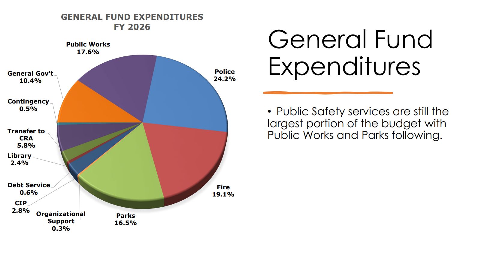 Property taxes provide the largest share of the city’s General Fund, which pays for police, fire, parks, roads, and other services, including cybersecurity for public data. The General Fund totals about $90 million this year, with property taxes contributing roughly $39 million, or 44% of the total—enough to cover both the police and fire budgets, which are the fund’s largest expenses.