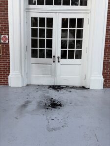 A pile of ash and smoke and heat damage can be seen at the church doors after the banner was set on fire. (Photos courtesy of First Congregational Church of Winter Park)